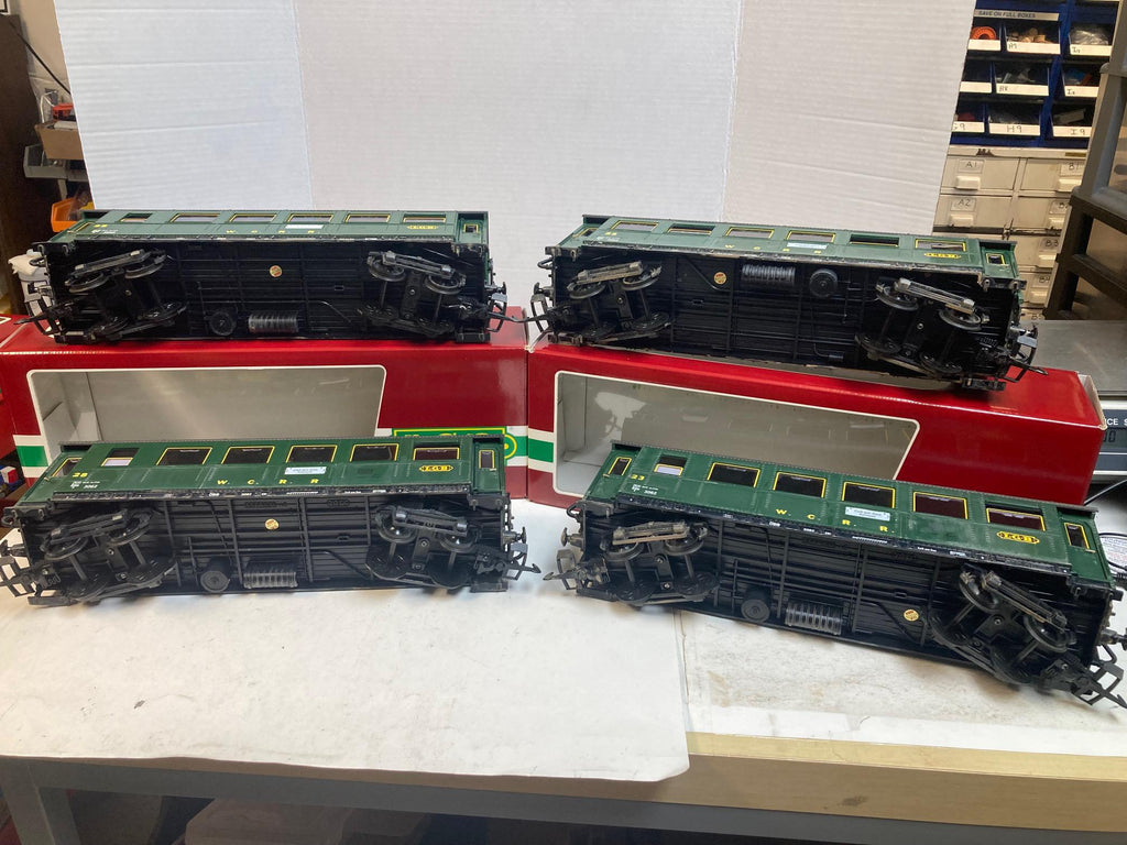 Pre-owned LGB 4-car passenger set consisting of car numbers #22, #23, #25, and #28. These are based on the LGB 3062 passenger cars and have been custom weathered and lettered for W.C.R.R.