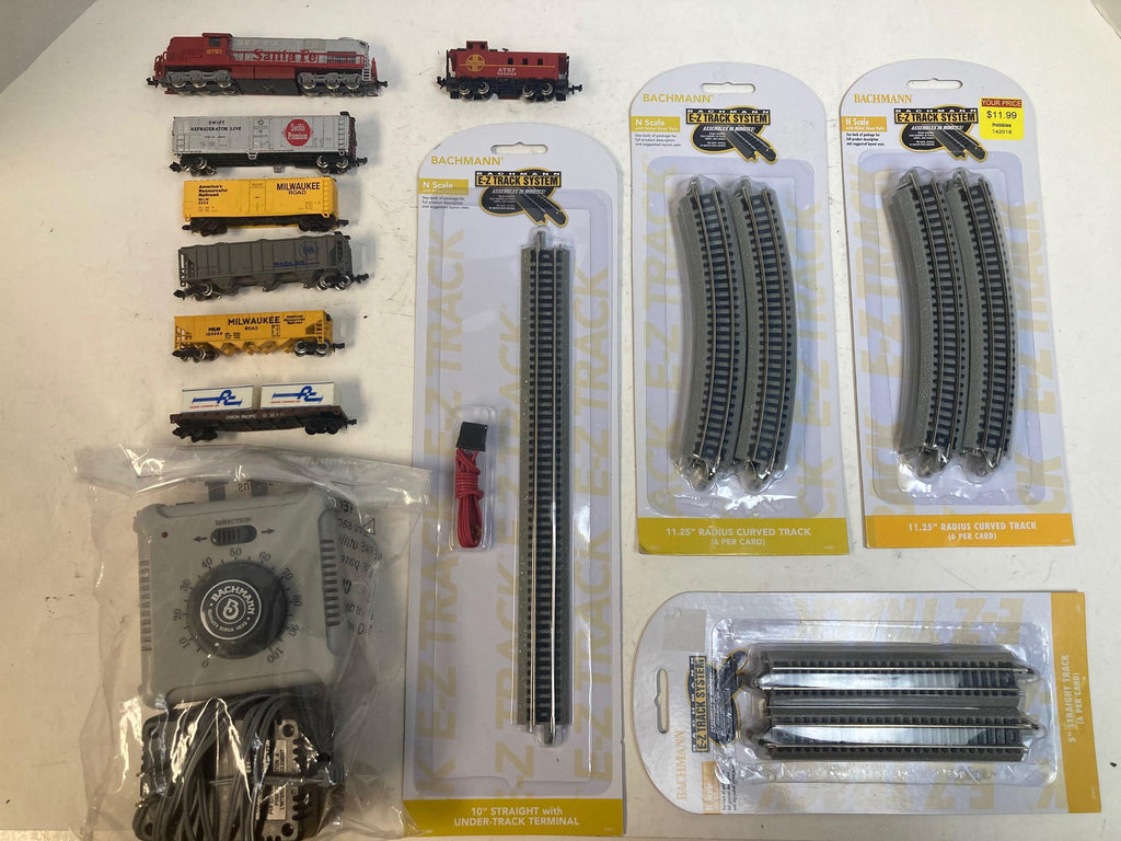 Up for sale is a complete N Scale train set including locomotive, rolling stock, track, and power supply.