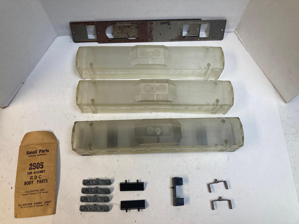 Up for sale is a lot of clear plastic RDC passenger car shells with additional small parts, from the All-Nation Line hobby series. These are vintage model train parts, ideal for restoration, kitbashing, or custom O gauge passenger car projects.