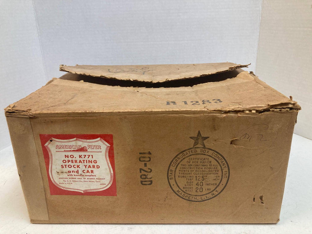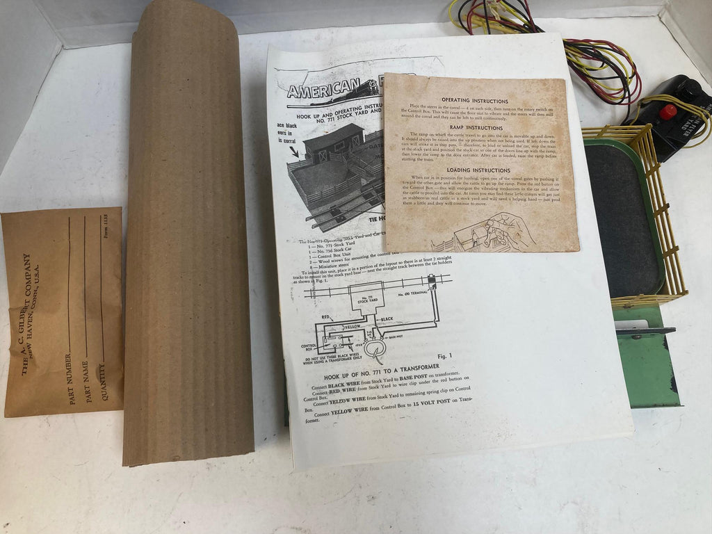 Up for sale is a vintage American Flyer No. K771 Operating Stock Yard and Stock Car set, produced by Gilbert. This is a classic S-Gauge operating accessory that adds great action and realism to any layout.