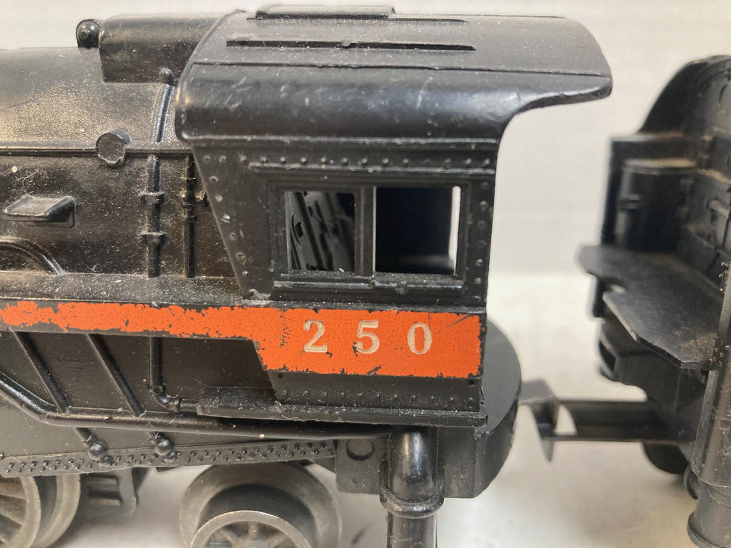 The Lionel 250 is an early postwar 2-4-2 steam engine made with a pressed-steel body, manual reversing lever, and simplified construction, targeted toward entry-level or “Scout” sets.