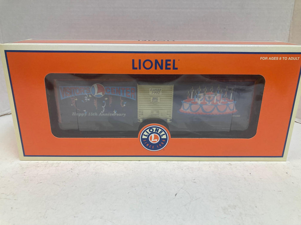 New in box, factory-sealed Lionel Visitor Center 15th Anniversary lighted boxcar #6-36841. O Gauge, lights installed, perfect for collectors or display. Never used.