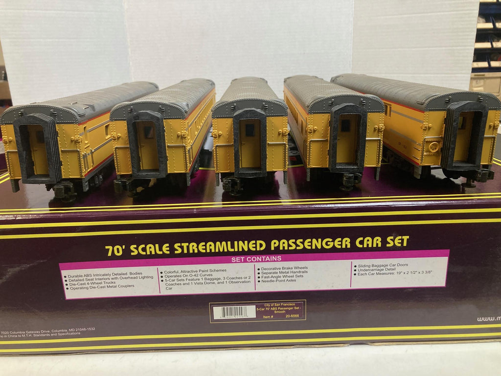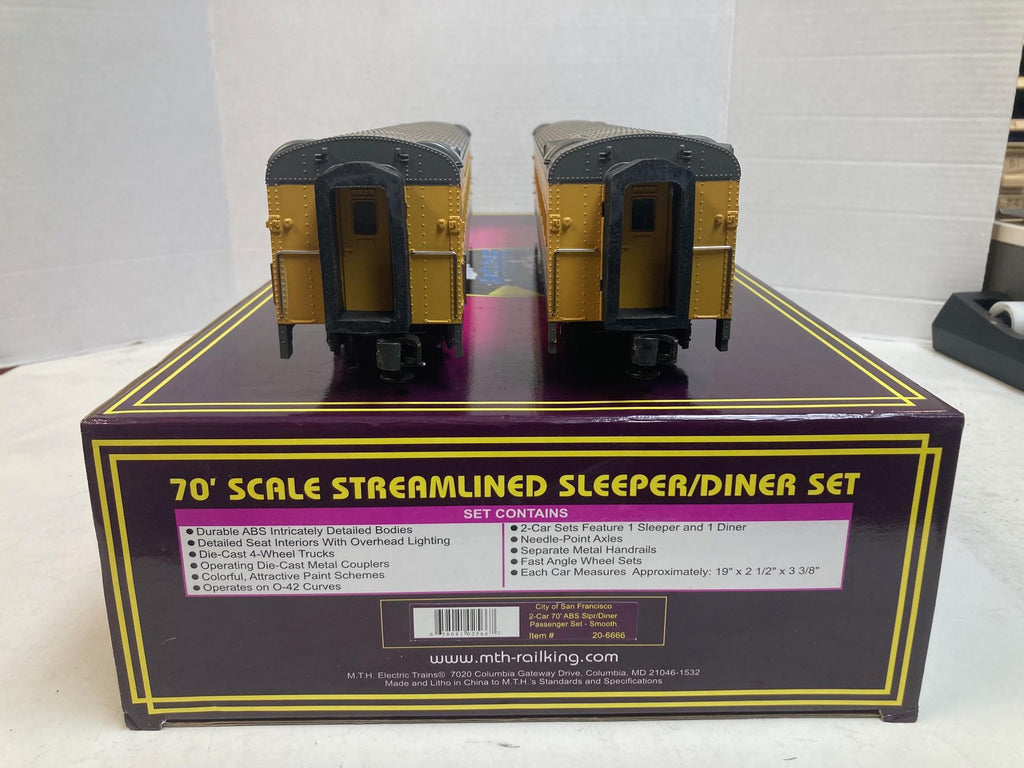 Up for sale is a complete 7-car MTH Premier Union Pacific "City of San Francisco" passenger consist. This set combines the 5-car base set (20-6566) with the 2-car sleeper/diner expansion (20-6666).